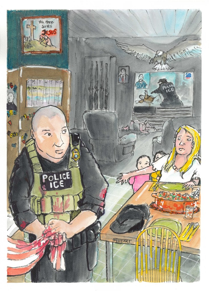 This illustration comes after the killings of Renee Good and Alex Pretti in Minneapolis by ICE agents, and after countless acts of violence and illegal arrest of citizens and non-citizens alike across the US. As an artist I don’t know how to respond to the violence happening now, but I appeal to those still supporting ICE.