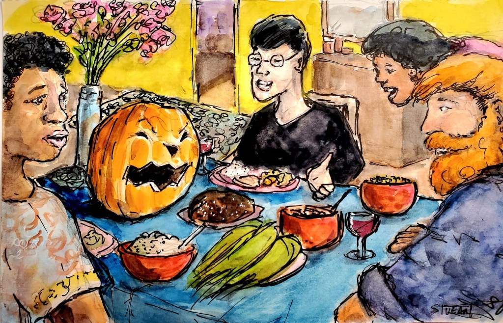 So, I told them about how as a young man I was on shore between assignments—in my merchant marine years—and had met someone at a bar, as one does. But times being what they were, we were followed and harassed by a group of Angry Young Guys. “Ulrich showed up and did what he does best.” I leaned back in my chair to dramatically replay the scene, “He comes riding up on a horse, his head all aflame, scares them, and then he takes that flaming head and throws it at them! It streaks like a comet and hits one of them right in the chest. Boom! He lit up, tore off his shirt and ran screaming! Then Ulrich’s body, still on the horse, pulls out his sabre and holds it high in the air as his horse rears back!” I caught him looking at me. Did he remember that? “They ran off. I had to convince my guy to stay. He was plenty rattled too. But you know, I believe they would have hurt us that night. Maybe killed us. And I,” I raised my glass of wine. “I owe my life to his penchant for throwing his head at people.” Ulrich’s mouth moved and his eyes got softer, “I don’t like people.” Kate, Ashantu and Ravenwood all looked at him as his whole face became animate. “Normally,” he added. He smiled a jagged smile. “I throw my head at everyone. He’s not special.” I looked at him. Rave asked, “Why don’t you like people?” Ulrich said flatly, “They’re monsters.” He looked quickly at them, “Normally.” He said, “I just don’t like to be bothered.” His pumpkin mouth stretched a little to grab the straw to the soup, sucking it down. He smiled. “Normally.” It felt like he was warming up. “My body is coming and will cut off your head,” he said to me. “SLICE!” he shouted. They all looked at me. “Did you know that Ulrich was in the Revolutionary War? Part of a cavalry.” That began a whole conversation where Ulrich was the center of attention, talking about the war, about his life. I buttered another roll. I may lose my head, but I still thought the risk was worth it. He was enjoying himself. After an hour of lively discussion about cannonballs and mercenaries, Kate eventually got up and brought out a pear tart with blue cheese. It looked delicious. There was a knock at the door. Ashantu opened it and a headless man in a cape and boots, brandishing a sabre, walked through. “At last!” Ulrich said, swiveling his whole pumpkin around. “Come my Body, and take what is ours!” We all stood up, backed away from the table. “Yes!” Ulrich said, spinning his head to look at us. “SLICE!” The body stepped up to the table, his sabre raised, and sliced five pieces of tart. “But first, I want a taste of that pear tart.” He smiled at Kate. His body put down the sabre, picked up the head and placed it back on his shoulders. Then Ulrich Van Hesse, the Headless Horseman, my original Plus One, sat down for dessert.