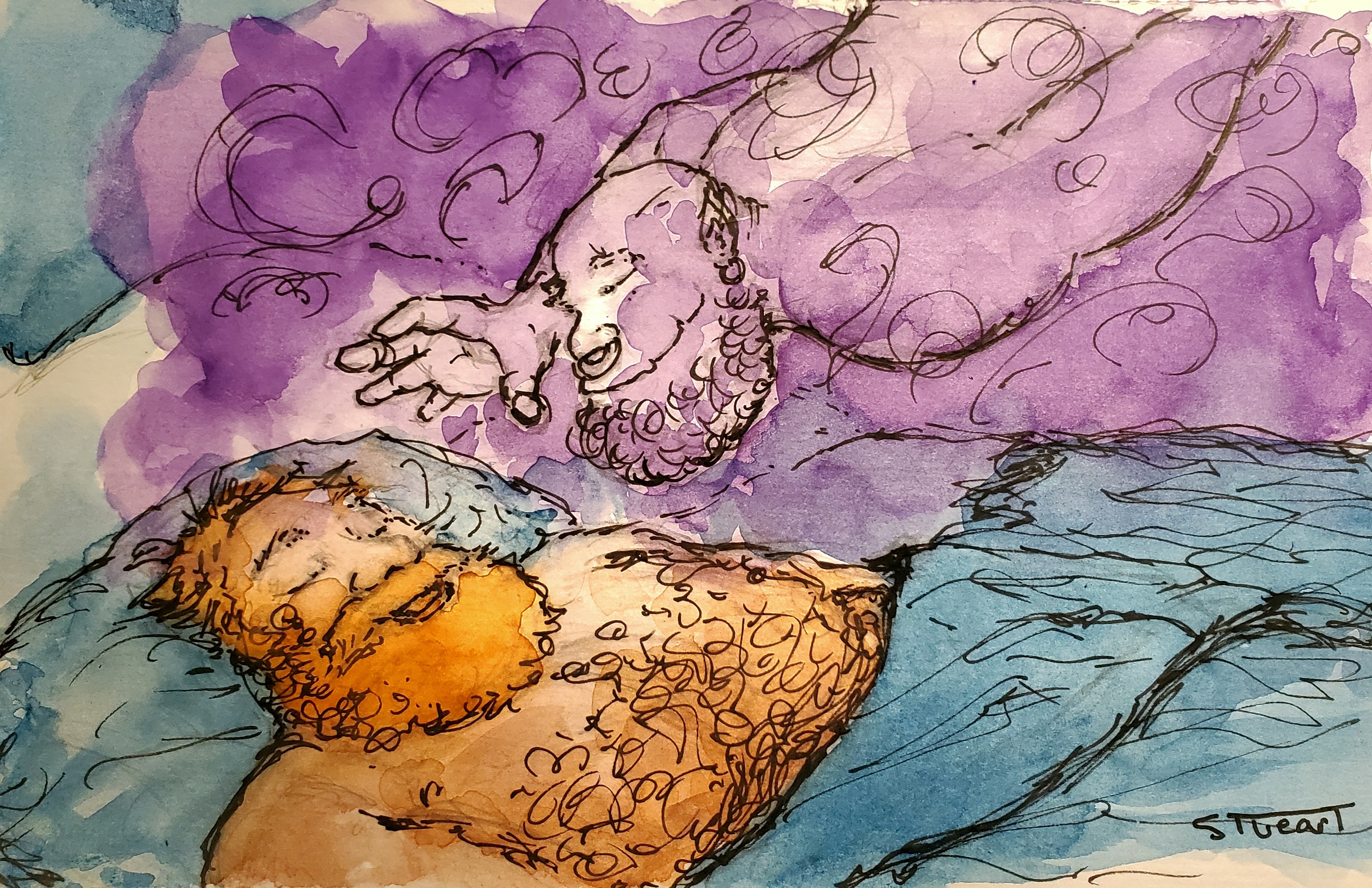 He talked about the Elders, he called them. That he had given them all dreams and come to them to talk to them, long conversations sitting on the edge of beaches, standing on mountain peaks, laughing over a breakfast, and gentle, beautiful erotic dreams. “I have fallen in love with every one of them. I know all the names of their 456 grandchildren, and they are all adorable,” he beamed.  I told him that was wonderful. “However,” he said, “I’m running into a problem.” Many of them were religious and had conservative backgrounds — oh, I thought, the demon problem. He said, “No, it’s the erotic part— their dreams are so intense and wild and beautiful but they wake up sometimes with such guilt and shame. They’re embarrassed by their dreams and thoughts. Sometimes I erase the connections between their waking life and their dream life so that they aren’t haunted by their pleasures. But I hate to do that. I want them to remember. They want to remember.”
