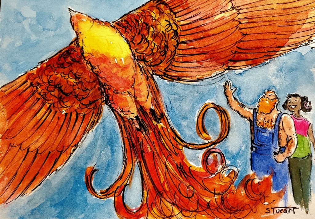 Angela said, “I know so many people who are phoenixes. Born out of fire. They may not change into a bird, but they are just as magnificent when they transition into who they are.” She squeezed my hand, and we watched the phoenix move now like a slow comet, bright, blazing, back into the sky.