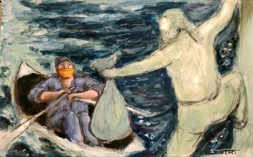 I rowed the tender back to the ship where the other five men had gotten aboard. They would not let me climb up. “He has the letters,” someone said. They talked about whether it was safe to bring me aboard. It was not. But it also wasn’t safe for me to stay in a tender in the approaching storm. “Throw the letters into the sea!” they yelled, “And we’ll pull you up.” I said I couldn’t do that. I made a promise. “But you also promised not to let any monsters hurt us. How do we know the letters won’t hurt us?” I called up. “They need us to deliver the letters.” And, I added, I knew that this gift I had would never kill me—because monsters needed me— so therefore, I knew the boat I was on wouldn’t sink. I was hoarse now and couldn’t speak any more and the storm was loud, and the sea was getting rougher. They decided they could not let me die. They hoisted me up. They all stared at the bag which was now just an old burlap bag. They wanted to open the bag. I kept it firmly shut. Not till we were safely on shore, I urged. I tied the bag even tighter with rope and put in a plastic bag to keep it water resistant.