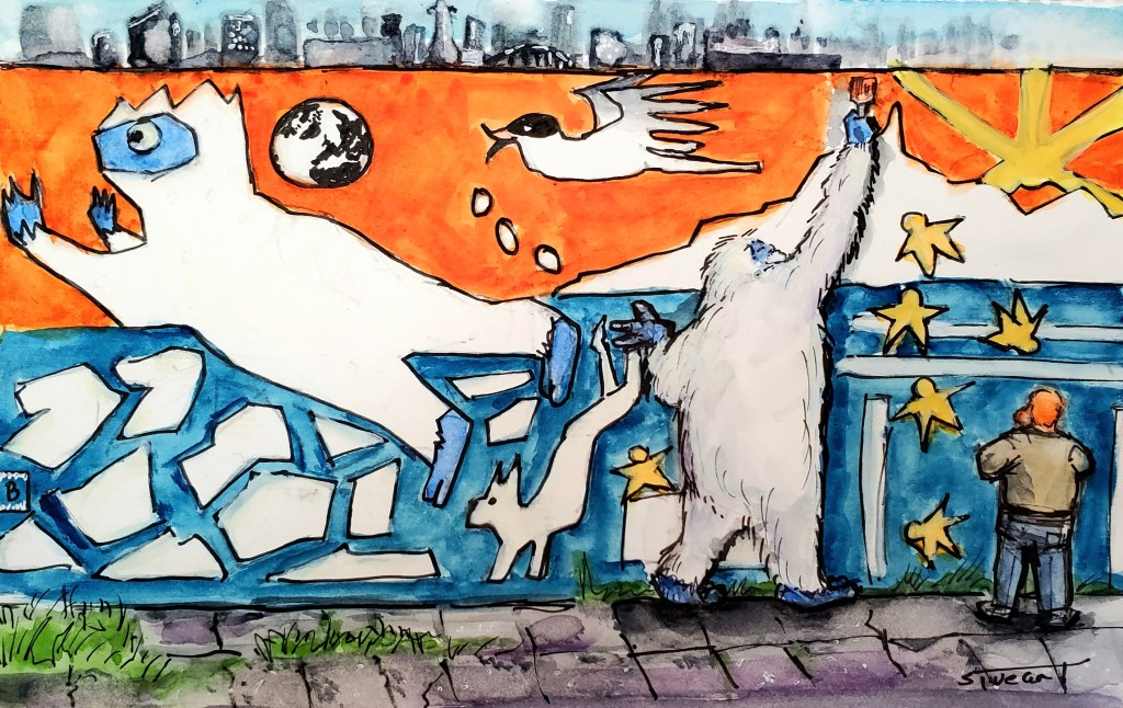 I see the hot orange sky, the ice breaking up, the black continent Earth from the Northern perspective. <People aren’t watching this clock very well,> he tells me. <The land is telling them that time is running out to change bad habits, but they won’t see the clock.> He shakes his head. <Out of time.> He points to different places of his mural, and tells me about it. <They are escaping the hot land. The Tern drops its eggs when it has to leave. The fox jumps into the water. The Bumble tries to balance on ice flows.> “And these stars that are falling?” I ask. He smiles. <Those are people. They opened a box here. And now they are all falling into the box here.> When I ask him what the box was, he says, <Everything they wanted.> Now the box just collected their bodies, I guessed. <People need a new Climate Time Zone national campaign that has a day that gets smaller every year. Less time to work. Less time to play. Less time to change. No 24 hour day but a 12 hour day, maybe. Short time. Shorter time. Shortest time. Then no time.>