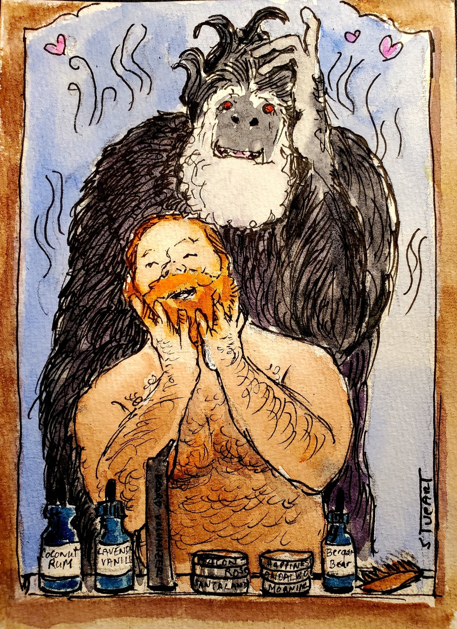 When he said, ‘surprise them” and “spice things up,’ of course I led him to the beard oil. All three of them liked strong scents, but lately he just felt like something was missing in the kissing. So, all those small animals he killed was his way of trying to improve his smell, but, of course, the neighborhood couldn’t tolerate any eventual assault on their pets. I introduced him to all the scents I had in stock. He sampled patchouli, Happiness (a citrus blend), Rose, Lavender and Vanilla, Daddy (a version of Smoke and Leather), Dusk (a spicy musk) and Bergamot Bear (green tea and elderberries). He liked them all. And eventually decided to rub some of all of them in different areas. He said his mates would then get to rediscover him in stages all over his body. I smiled at his thoughtfulness. Finally, like a good friend and his first hairdresser would, i suggested some hair gel which he used to turn his hair into waves of black meringue. When he was finished, I gave him a variety pack of scents in a small bag. ‘They’re gonna love you, ‘ I told him. He grinned, and walked out into the night, his fur radiating a whole summer of desire.