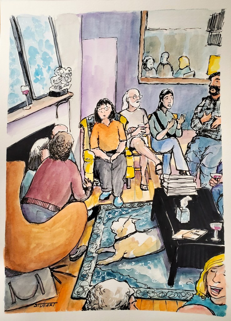 And the big protests are an outlet for those people too–where we can all come together, peacefully, for change. Here’s where you hatch ideas that 20 people can carry out, and that can spread to other groups meeting in other homes. Our group talked about Cash for Change, the idea of using only cash to pay for things so that corporations don’t keep getting their share of your dollar every time you swipe a card. The store doesn’t get that money. The banks and larger credit institutions receive that percentage off of every sale. Cash for change–if a large number of people did it–would hurt the revenue they are collecting. And that’s kinda what these groups are for. How do concerned citizens get the attention of billionaires? How can we, small but mighty, make a difference against powerful people? We have power–but we have to cooperate to do it. These small groups can help foster new ideas. They still need the mass protests though–and large numbers of people. And until those numbers HURT the established order of things, until there is a general strike, people standing around for 2 hours may not make a huge difference to the oligarchs. But when people begin to stand around for days and shut things down–that may get their attention.
