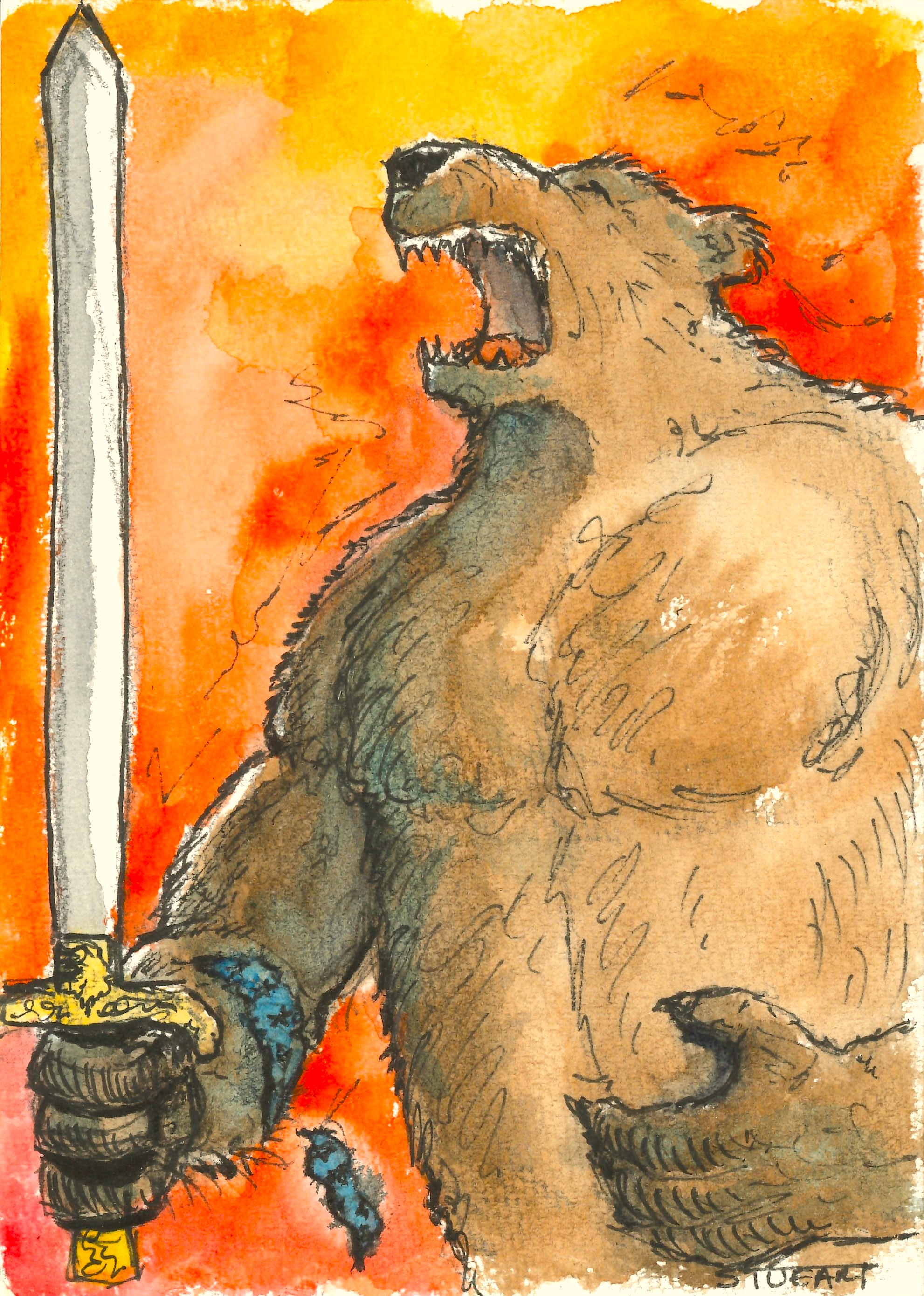 A bear came through the trees carrying Stench and Cassie. A bear with a huge sword. The orcs saw his size. He was larger than any of them. That bear must have been seven feet tall. But he was helping the other animals. The orcs that saw him, though, and ran straight for him, leaving Fenestra’s second or third puppet (she had lost count how many the other orcs had killed) fighting air. Was it because he seemed so much like a champion with that sword? But that bear’s arms were full of wounded. He could not fight without dropping or injuring them.