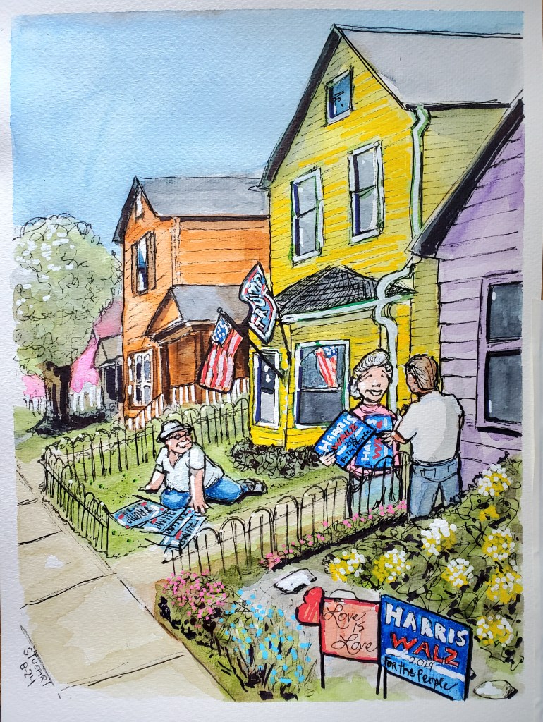 “Revolution Begins at Home,” Jerome Stueart, (11 x 15), watercolor, mixed media on paper. October 18, 2025.