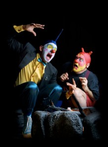 Canadian clowns, Mump and Smoot (with Thug), were in Whitehorse tonight in a revival of their first show together, Something. I was led to believe it was going to be scary, or disturbing--but these were not scary clowns. While there are some grotesque moments, there’s a charming show beneath the grossness. It stems from the deep friendship between characters Mump and Smoot, developed more than twenty years ago by John Turner and Micheal Kennard.