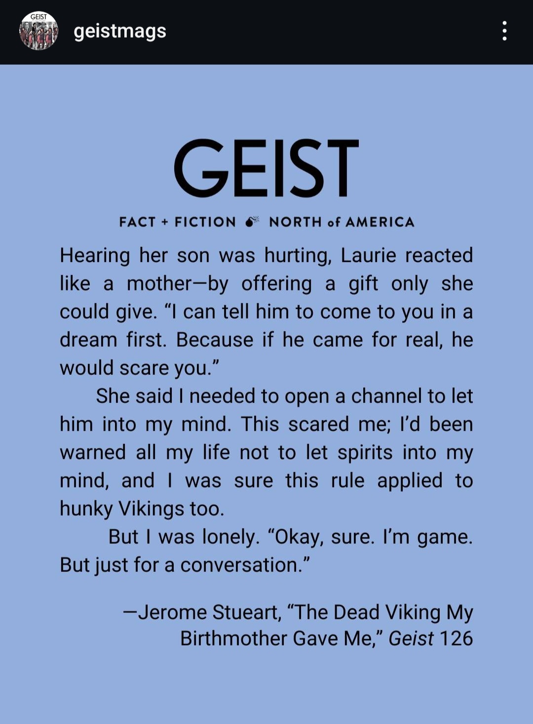 My essay, “The Dead Viking My Birthmother Gave Me,” is up over at GEIST Magazine online. It’s an essay about adoption, being queer, being lonely in the Yukon during Winter, and spiritual differences between a birthmother and son that include what one might do with a hunky centuries-old Viking spirit guide, and it’s all true from what I can remember.
