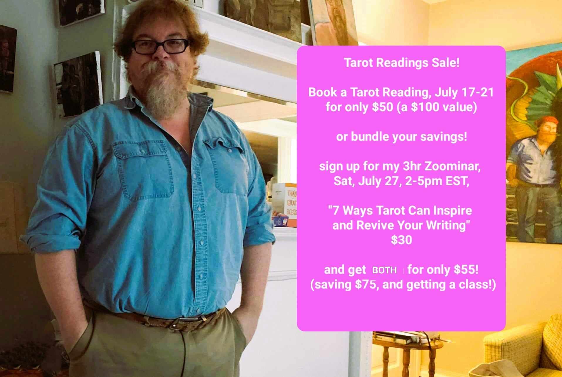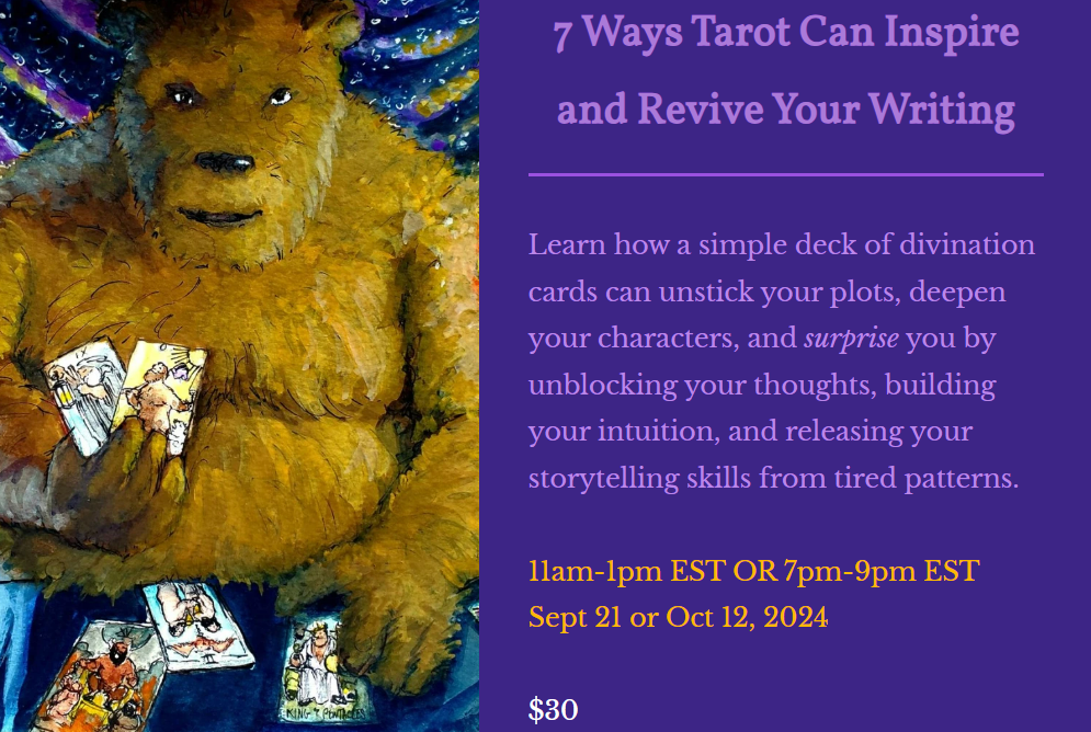 Come join us to delve into the archetypal and intuitive use of tarot to solve your writing blocks. You’ll get a cheat sheet of 78 card meanings, some sample spreads that can help you untangle a plot, complexify a character, or just get you unstuck as a writer. We will solve your problems together LIVE–and demonstrate how the cards help you develop your intuition in ways that will permanently expand your writing skills! Indicate WHICH DAY and TIME during payment in your note.
