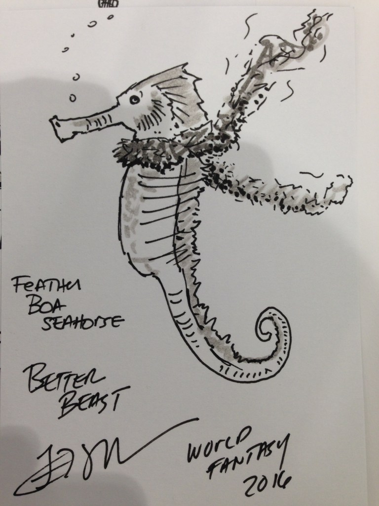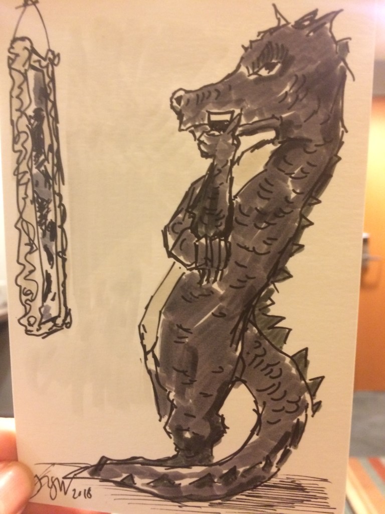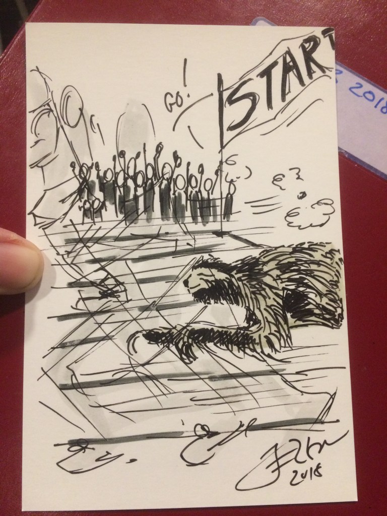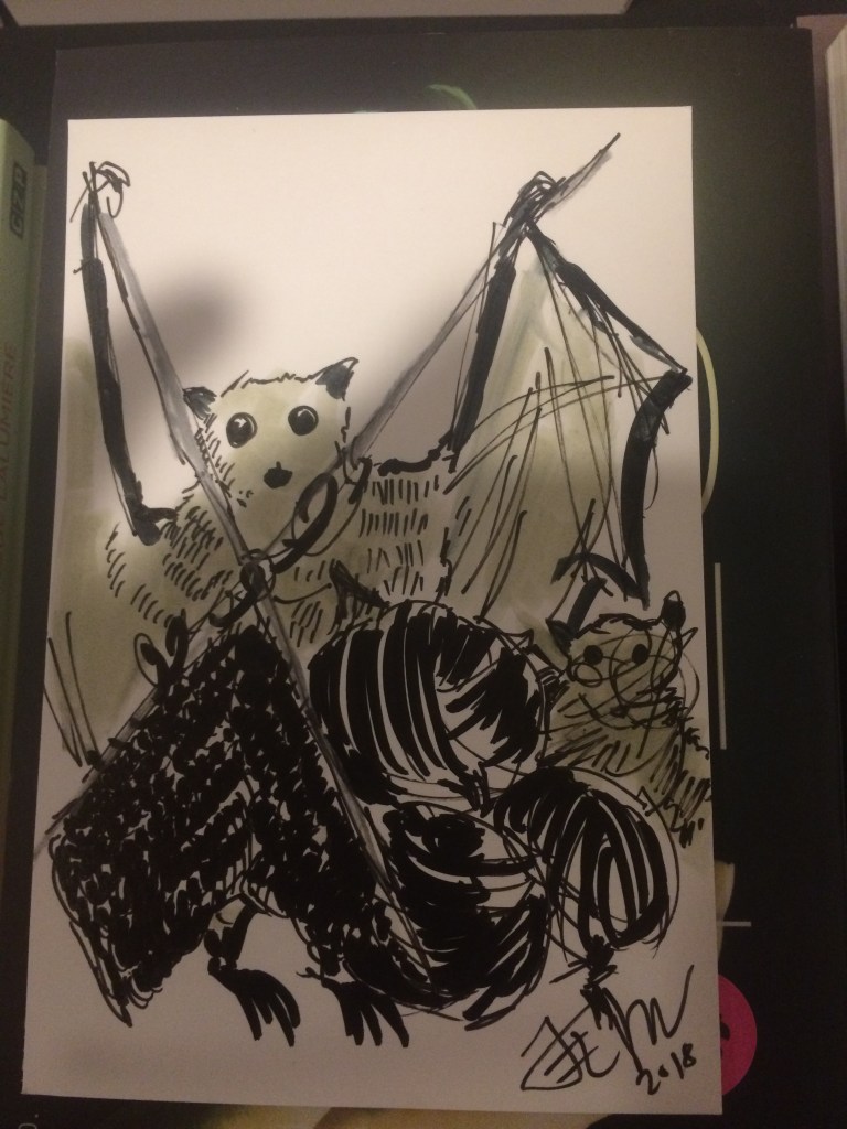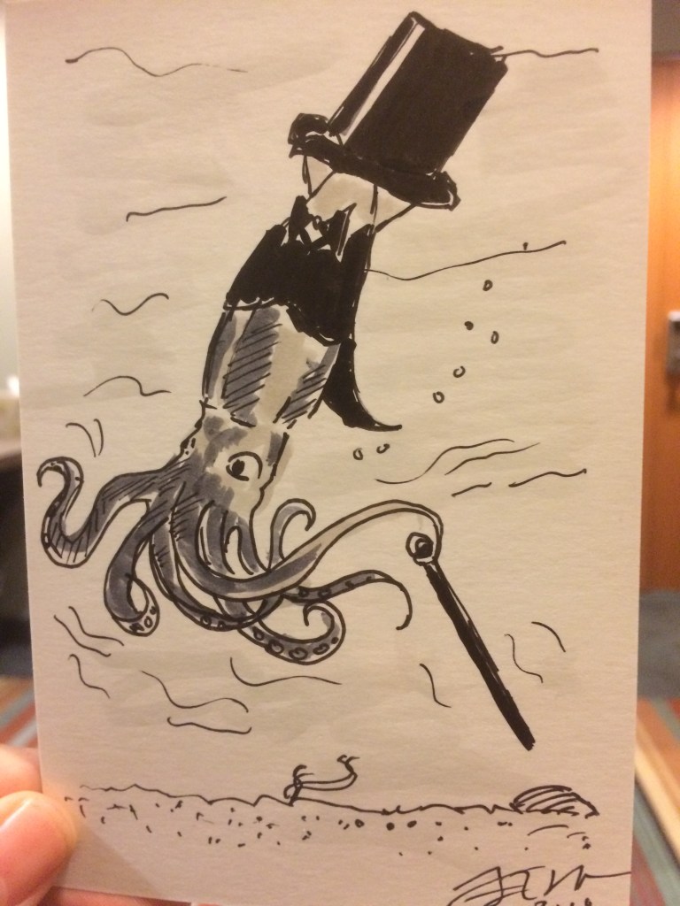 When I sell someone my book at conferences, I often offer the buyers a drawing of their favorite animal doing something as an extra gift. It’s a cool challenge! We always end up with awesome, weird things. Here are a few of the ones other people have challenged me to do.