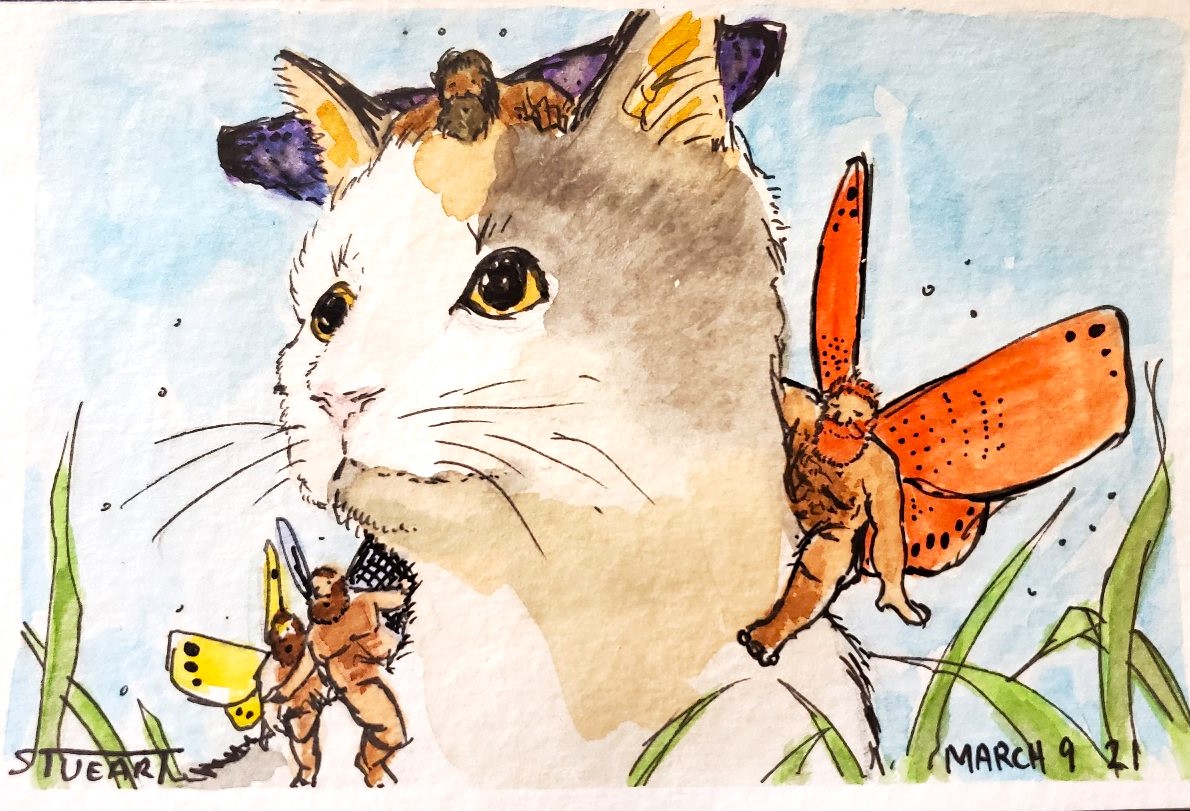 Some of my 2021 Hairy Fairies work…. you can find all 120 of them at the Squarespace site under five different headings: Cats, Birds, Flowers, Courtship and the original “Gardens of the Mythbegotten” where it all started in 2020.