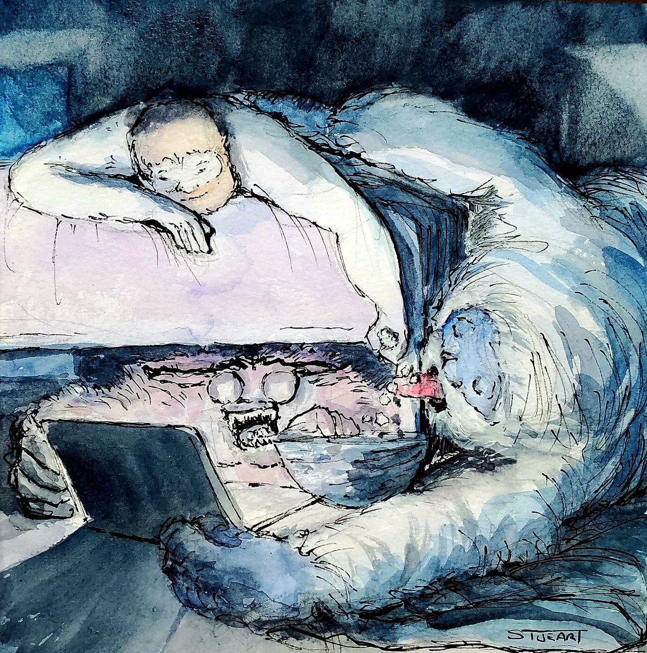 That’s the Black Dog of Death coming to visit Yukon and Bumble, sleeping on the big bed, being kept awake by Bumble’s snoring.