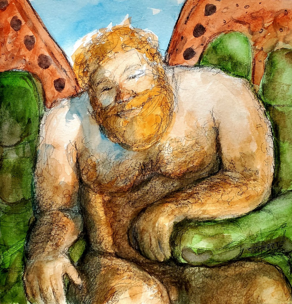 Here is a hairy fairy seated comfortably in the garden-gloved hand of Yukon. (As you might remember, there were a few ginger-bearded fairies with red butterfly wings in my fairy paintings from last year). He’s come over to chat. If you also recall, these fairies are in a special place that doesn’t connect well to the rest of the world, and they were also afraid that they might get lost if they ever left their own protected garden. But sometimes it takes a brave soul to try— and be the explorer, see what is out there, and then attempt to get back. Sort of a Fairy’s Hero’s Journey!