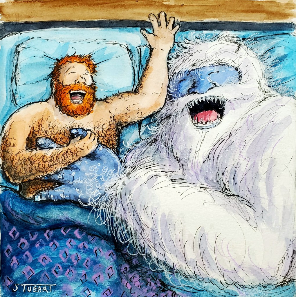 In 2019, I created a set of 10 paintings of Yukon Cornelius in the style of NC Wyeth — a style of boy’s adventure books popular in the early 20th Century, to explore what a gay hero might look like to me — the kind of gay hero I wish I could have had growing up. In 2022, I completed a show of about 50 paintings, acrylic and watercolor, with stories to go with them, titled, “The Further (Queer) Adventures of Yukon Cornelius,” where he went out to help other cryptids sometimes with his partner, Bumble. It gave me a gay hero that I would have loved to have read more about. We only got 10 min of Yukon Cornelius in “Rudolph” but it made me want to see what might happen if we had more time with him. Who else could he radically accept?