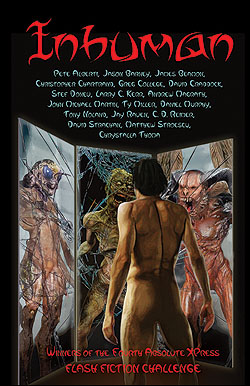 The anthology is made up of flash fiction–stories under 1000 words–part of the Flash Fiction #4 Challenge that Absolute XPress issued earlier this year. The stories discuss what it means to be human from an inhuman POV. Some stories are all from that POV, and some have characters that are inhuman chatting about humanity. I was the guest editor who helped choose the stories, but I’m proud to say that the judging was blind and that his story was chosen by all three judges. I had no idea if we were going to end up with Dave’s story in the bunch. There were a lot of great entries and we couldn’t put everyone in–but collectively we ended up choosing great stories.